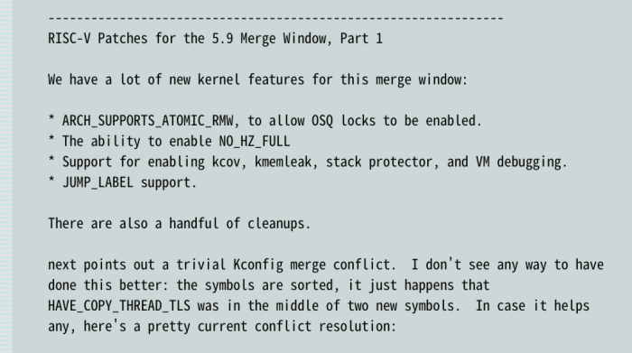 Linux 与 RISC-V 的相互发展正变得越来越多,比如最近的有开发者为 Linux 添加了一系列 RISC-V UEFI 支持补丁。通过邮件列表我们现在可以看到,在当前 Linux Kernel 5.9 合并窗口阶段,有一批 RISC-V 支持程序被提了出来。