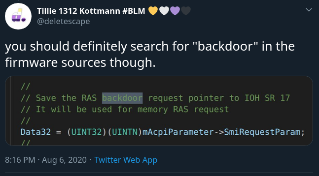 Tillie Kottmann表示,他从一个匿名来源获得了这个链接,其中大部分信息都是Intel受法律保护的知识产权。这位工程师表示,他被告知这是Intel今年早些时候遭受入侵并被盗取的数据。“他们通过匿名来源把这个给我,他们今年早些时候入侵并获取了这些信息,更多细节将稍后公布。”