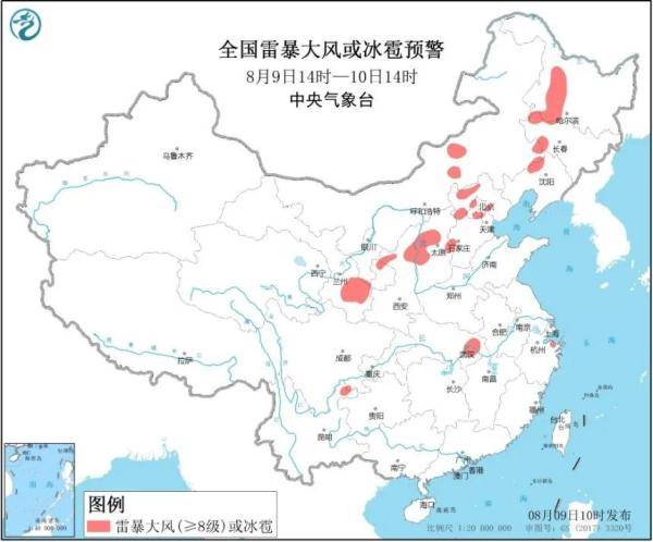 预计8月9日14时至10日14时,内蒙古东南部和中部、黑龙江西南部和中部、吉林中西部、辽宁北部、甘肃中东部和南部、陕西北部、山西中北部、河北中北部、北京西部和东南部、天津北部和西部、湖北东部等地的部分地区将有8-10级雷暴大风或冰雹天气;内蒙古东部、黑龙江西南部和中部、吉林西部、辽宁北部和西部、甘肃中南部、陕西北部、山西中部、河北中北部和东北部、北京、天津北部、安徽中南部、江苏中北部和南部、上海北部、湖北东部和南部、湖南中西部和北部、江西北部和南部、浙江南部、四川盆地北部、贵州中南部、云南中南部、广西西北部等地的部分地区将有短时强降水天气,小时雨强30-50毫米,局地可达70毫米以上。