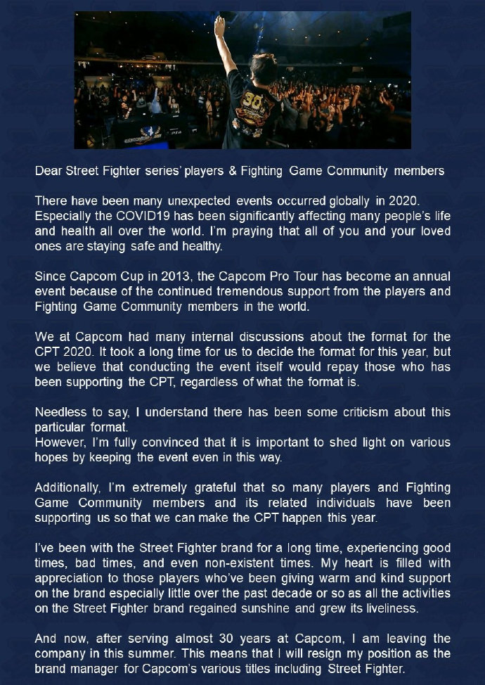 《街头霸王》系列制作人小野义德宣布将于今年夏季从卡普空离职,卸任《街霸》执行制作人和Capcom品牌经理。他已在卡普空工作近三十年。小野义德最初是以声音制作人的身份加入了Capcom,参与开发了《洛克人》、《龙战士》、《鬼泣》等游戏的开发,后来转为制作人,负责了《丧尸围城》、《Shadow of Rome》、《Capcom Fighting Jam》等游戏。