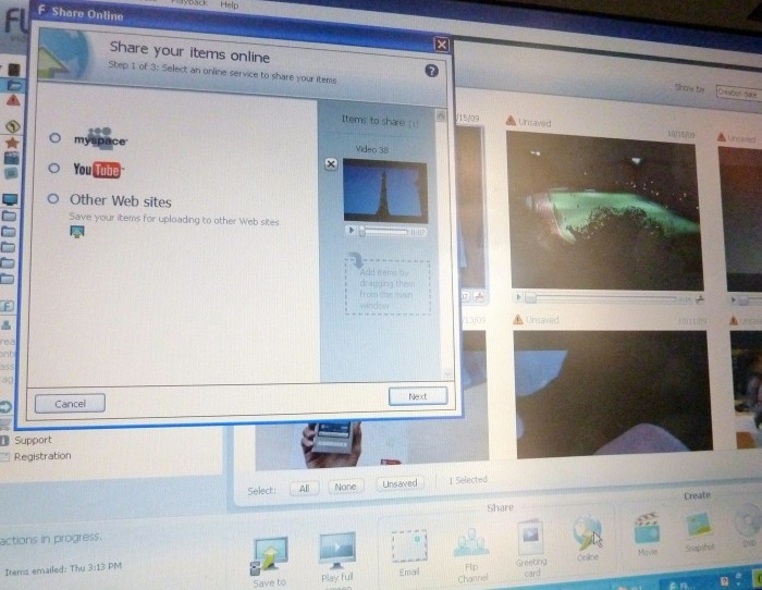 它的侧面增加了 HDMI 输出,可以直接连接电视观看视频、照片,在电脑上可以使用配套的 FlipShare 软件管理文件。