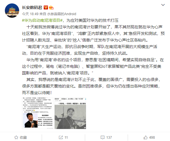 华为以“南泥湾”的名义启动新项目,自然是要通过“自力更生、艰苦奋斗”,“在困境期间,希望实现自给自足”。