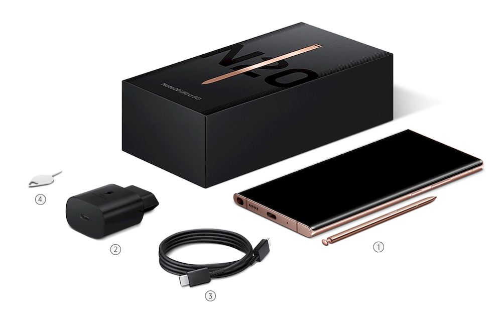 在 Galaxy Note 20 的产品页面中,其中有“what's in the box”(包装内产品清单)的图示,可以看到只有四项东西,分别是带 S Pen 的 Galaxy Note 20 主机一台,适配器、数据线和取卡针,在北美市场销售的包装内不会包含有线耳机。