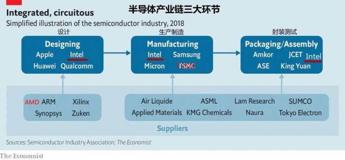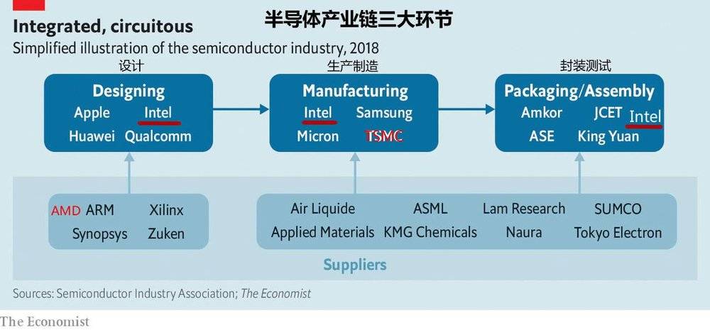 图片来自经济学人:英特尔既是芯片设计公司,AMD、英伟达、华为都划归在这个领域;也是生产制造工厂,这个领域里有台积电、三星、格罗方德、中芯国际等晶圆制造厂;还拥有自己的封测厂(在大陆有设厂),封装测试自己的芯片,这个细分行业有日月光、长电科技等头部企业。