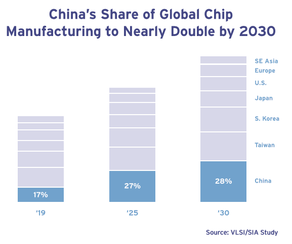 “美国在芯片制造方面严重依赖亚洲供应商,这是美国在这个产业上的弱点。从长期来看,中国大陆准备通过补贴大力建设60多家新晶圆厂,甚至会在2030年会成为全球最大的芯片制造国,占比翻番,这是对我们非常不利的。