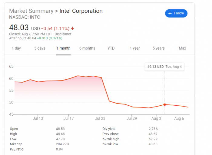 在发布消息后第二天,英特尔股价大跌近18%,从60美元断崖式下落到50美元,创5个月以来单日最大跌幅。