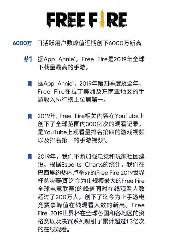 2020年第一季度,《Free Fire》持续火爆,成为全球Google Play下载量第三的游戏。日活跃用户数突破8000万。