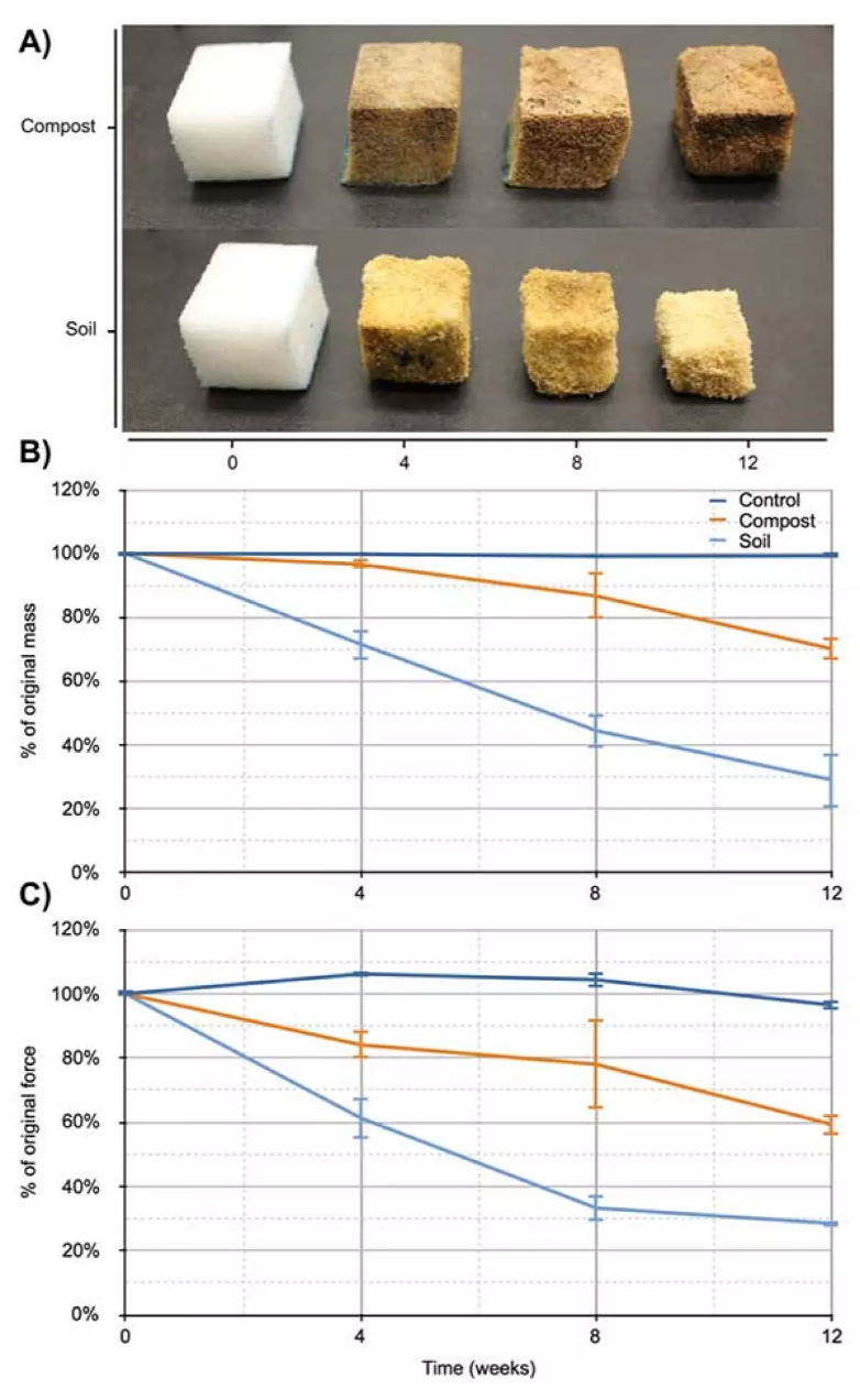 测试中,研究人员将泡沫放在传统的堆肥和土壤中,16周后这些泡沫在土壤中降解。为了确保材料对土壤没有毒性影响,研究小组跟踪了材料在整个过程中脱落的分子,同时他们也能识别驱动这一过程的生物体。