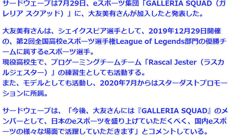 ·据官方介绍,大友美有现在仅有17岁,还是一位高中生,不过其光辉事迹已经有不少了,其所在的队伍曾在2019年12月斩获第二届日本全国高中《英雄联盟》部门的优胜大奖,平时作为玩家队伍《Rascal Jester》的练习生活动。