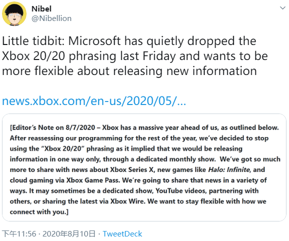 今年 5 月份的时候,微软承诺将每月举办一场 Xbox 20/20 活动,直到 Xbox Series X 正式上市。然而在 5 月的首场活动之后,微软就一直在放玩家粉丝们的鸽子。不仅 6 月份没有任何活动,连 7 月份的平台独占游戏展示会也没有冠上“Xbox 20/20”的名号。