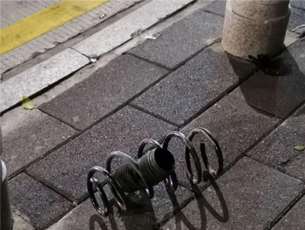 从现场照片来看,这辆理想ONE左前侧遭遇撞击,左前轮已经脱落,并且减震器弹簧也已变形脱落,“飞出”车外。而且车辆下方有液体流出。此外,事故现场有刹车痕迹,并且道路的隔离栏也被撞倒。