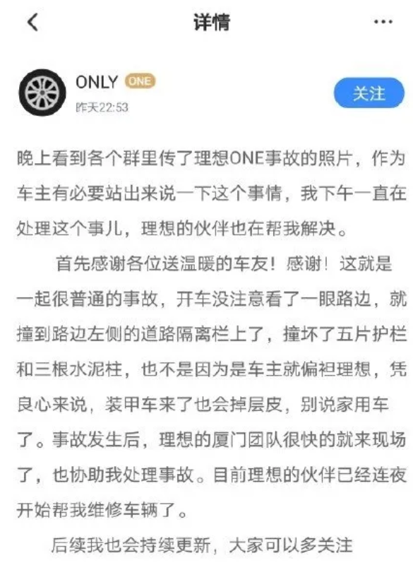 同时他对理想ONE的质量表示放心。而且,事故发生后,理想ONE的厦门团队赶赴事故现场,协助处理了事故,当前事故车辆已经开始维修了。