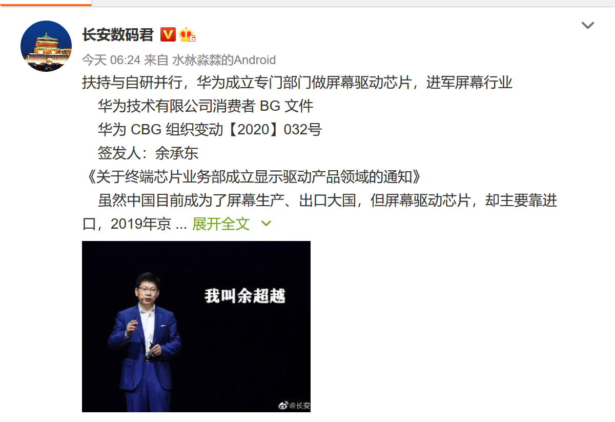 8月11日下午消息,数码博主@长安数码君曝料称,华为余承东近日签发了一份名为《关于终端芯片业务部成立显示驱动产品领域的通知》的文件,内容显示华为要成立部门做屏幕驱动芯片,进军屏幕行业。网传文件内容指出,虽然中国目前成为了屏幕生产、出口大国,但屏幕驱动芯片,却主要靠进口,2019年京东方采购屏幕驱动芯片金额超过60亿元,其中国产芯片占比不到5%。