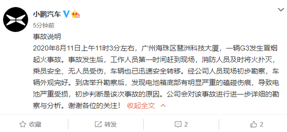 2020年8月11日上午11时3分左右,广州海珠区琶洲科技大厦,一辆G3发生冒烟起火事故。事故发生后,工作人员第一时间赶到现场,消防人员及时将火扑灭,乘员安全、无人员受伤,车辆也已迅速安全转移。