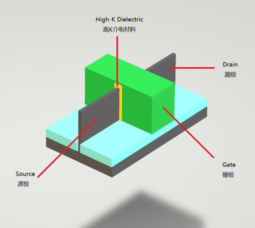 通俗点说,如果把电流想象成水流,那么图上的鱼鳍状半导体就是一根水管,源极和漏极就是水管的进水口和出水口,而中间的栅极则是水管阀门。