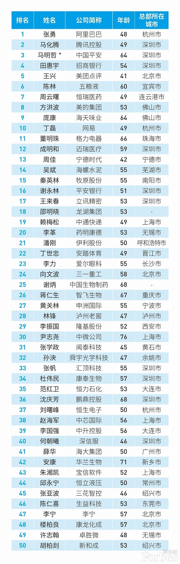 8月11日,福布斯发布中国最佳CEO榜TOP50。50位上榜的CEO的平均年龄在54岁,管理公司平均市值为3654 亿元,其中女性CEO有4位。从榜单来看,阿里巴巴张勇、腾讯马化腾、中国平安马明哲、招商银行田惠宇、美团点评王兴排名前5。此外,美的方洪波第8、网易丁磊第10,格力电器董明珠第11。