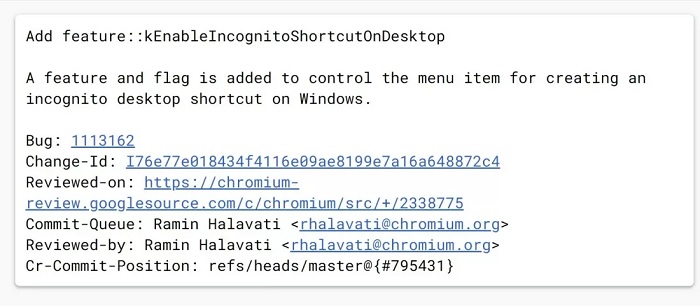 作为一项实验功能,Chromium Gerrit 博客中提到了浏览器代码中引入的一个新标记,以便为无痕浏览模式提供一个“创建桌面快捷方式”的选项。