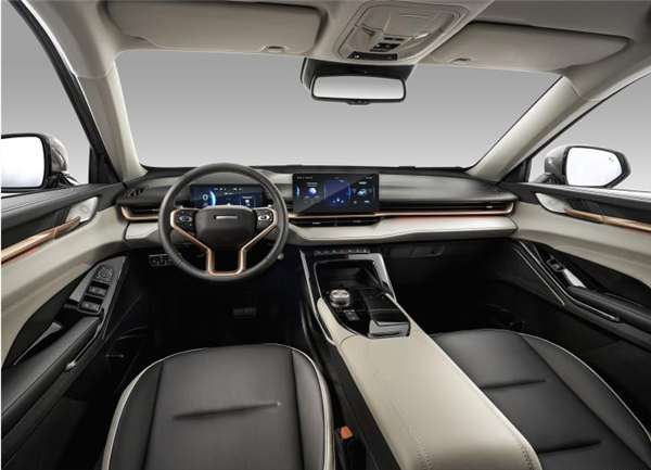 新车内饰也换用了全新设计,中控台利用多种材质、工艺和颜色拼接,质感显著提升;同时还提供全液晶仪表盘、悬浮式中控大屏、HUD抬头显示以及旋钮式换挡等。