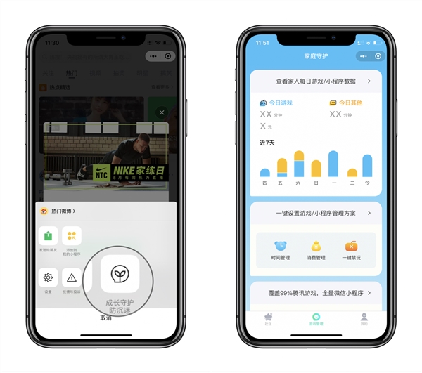 5、小程序新增防沉迷按钮和开发团队信息。点击“成长守护防沉迷”将跳转到“腾讯家庭守护”界面,可以在里面查看今天和近七天的游戏情况,包括游戏时长、游戏花费、登录日志等。