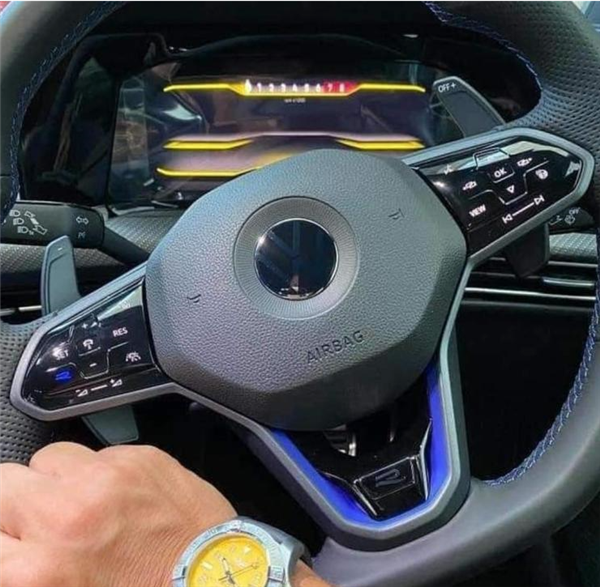 此次曝光的内饰部分显示该车将被配备全液晶仪表盘,巨大的换挡拨片可随方向盘一同转动,同时内饰多处细节均使用了蓝色元素点缀,进一步增加了车内运动氛围。