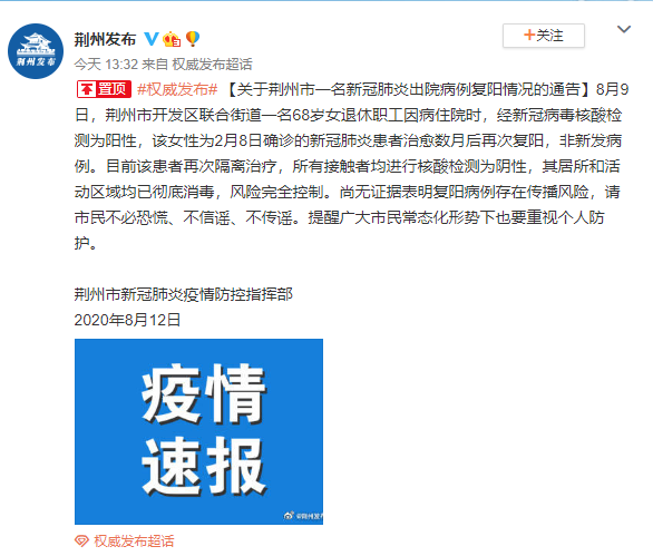 8月9日,荆州市开发区联合街道一名68岁女退休职工因病住院时,经新冠病毒核酸检测为阳性,该女性为2月8日确诊的新冠肺炎患者治愈数月后再次复阳,非新发病例。