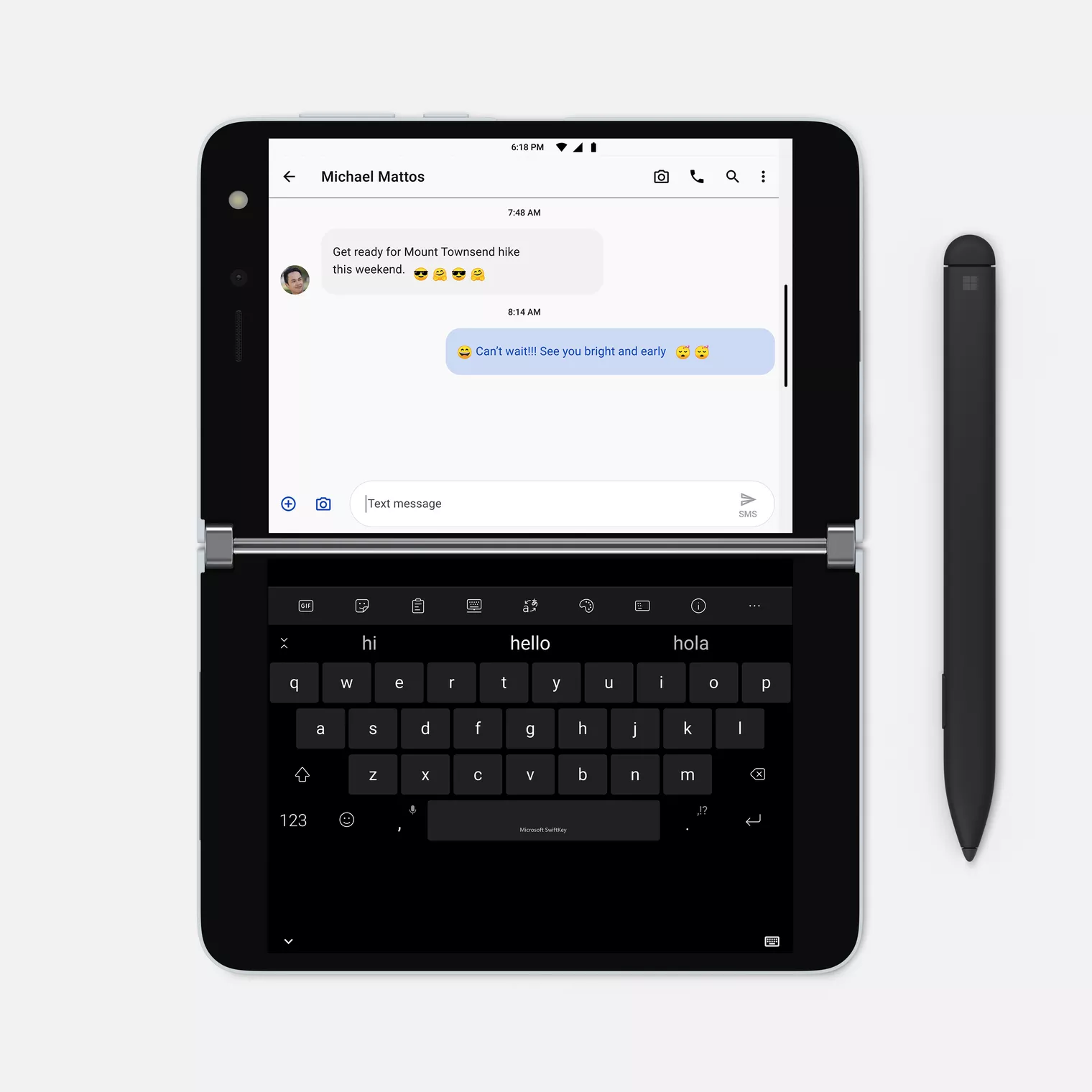 硬件方面,微软Surface Duo使用了两块不同的5.6英寸AMOLED屏幕,每块屏幕的分辨率为1800x1350px。当一起使用时,两块屏幕会生成一个8.1英寸的显示屏(但被铰链打断),宽高比为3:2,加起来分辨率为2700x1800px。