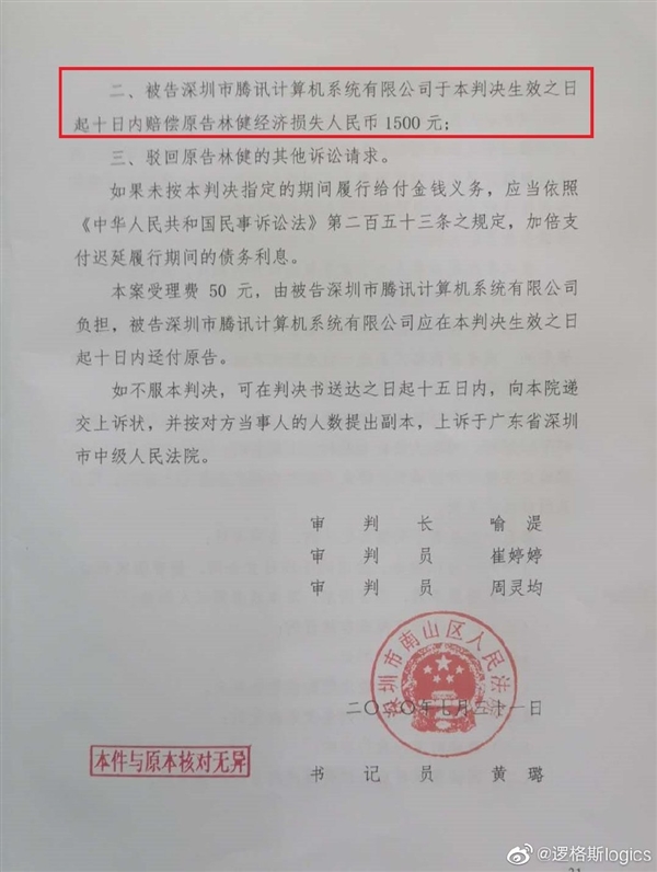 8月12日消息,@逻格斯logics微博分享了深圳市南山区人民法院的判决书。