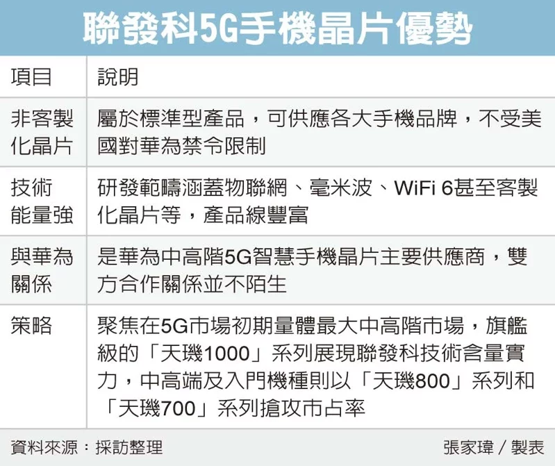 联发科在5G市场策略正确,相较于高通采“中高低阶全面撒网”的方式,联发科将有限资源集中聚焦在5G市场初期量体最大中高阶市场,旗舰级的“天玑1000”系列展现技术含量实力,中高端及入门机种则以“天玑800”系列和“天玑700”系列抢攻市占率。