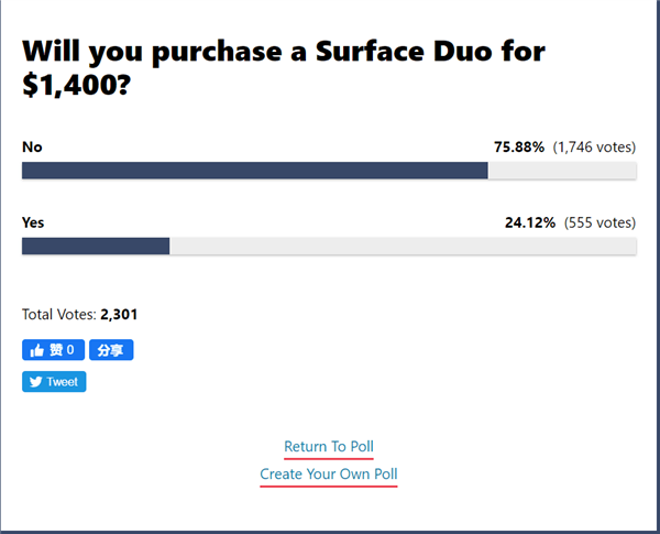 8月12日,微软发布Surface Duo,128GB版售价1399.99美元(约合人民币9700元),256GB版售价1499.99美元(约合人民币10400元)。Surface Duo是微软首款运行Android的Surface设备,对于这样一款新品,外媒Windows Central发起调研,有75%以上的网友不会考虑购买Surface Duo。