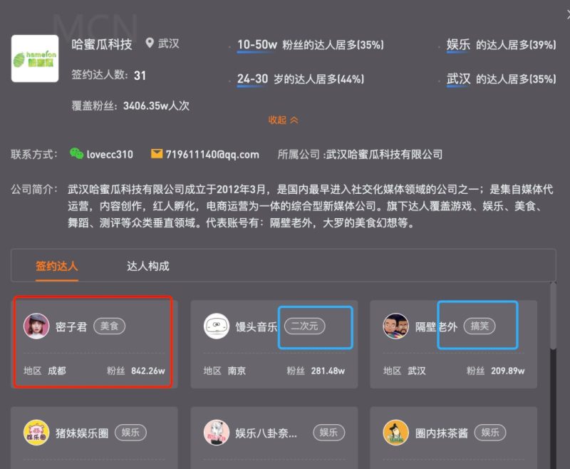 以哈密瓜科技为例,除了密子君一个800多万粉丝的吃播博主外,其余多为娱乐、情感类博主。另外包括一些比较知名的美食类大V,无忧传媒旗下的麻辣德子,洋葱视频的办公室小野等人都是其所属MCN机构中为数不多的美食类博主。
