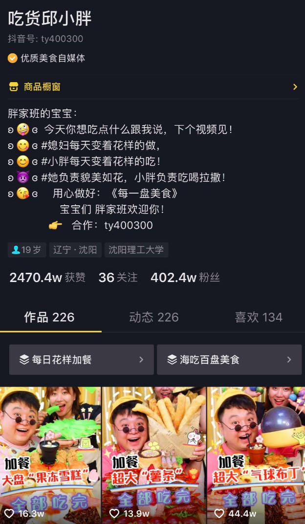 目前抖音上的头部“大胃王”博主代表包括“浪胃仙(3966w)、小甲同学(227w)、吃货邱小胖(402w)、密子君(842w)、大胃王朵一(404万)”等等,此外,在搜索栏搜索大胃王三个字便有“大胃王小鹿、大胃王阿浩、大胃王鱼子酱等”上百个相关博主出现,粉丝数从数万到上百万不等。