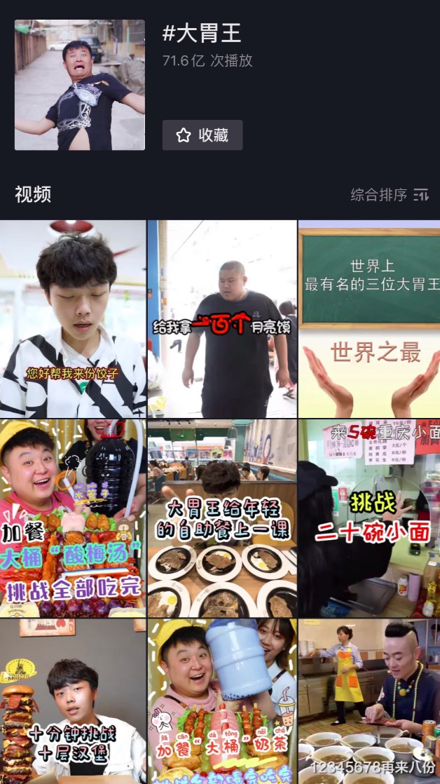 抖音上大胃王相关视频话题高达71.6亿次播放,话题下“十分钟挑战十层汉堡、半小时吃完100斤龙虾、一小时吃完20份兰州拉面”等花式吃播更是层出不穷。