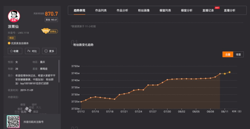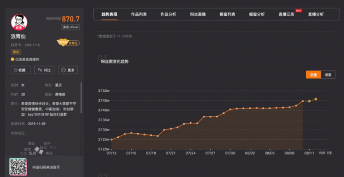 粉丝数方面,据新抖平台提供的数据显示,吃播博主浪胃仙7月12日时粉丝为3725万,到8月11日时粉丝已至3745万,近一个月来涨粉20万。