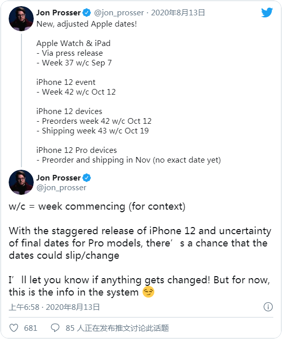 不过在后续的一条推文中,Jon Prosser 补充道 —— iPhone 12 的错峰发布、以及 Pro 机型的最终发布日期,仍有生变的可能。