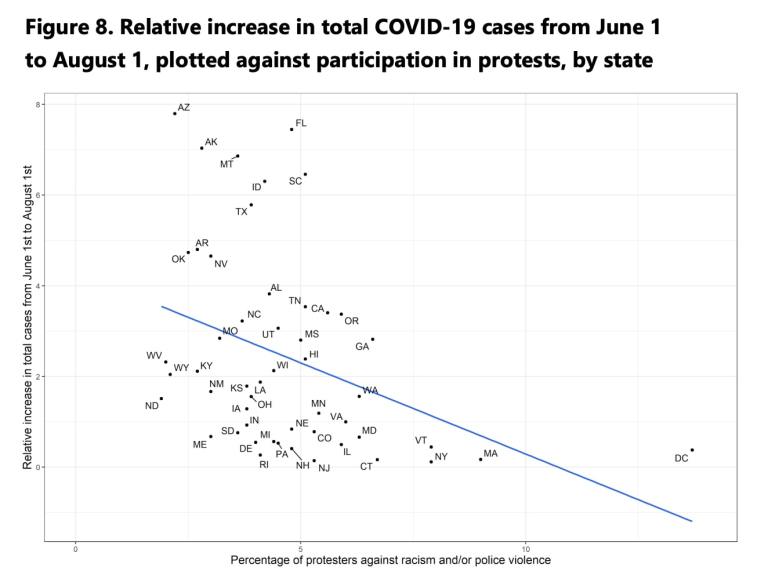 根据准备的关于调查结果的报告,“一个州的人口报告抗议的比例和随后增加的COVID-19病例之间有明显的和显著的负相关。因此,例如,华盛顿特区是迄今为止报告参与抗议活动比例最高的地区,达到13.7%,但在此期间,病例的增加率相对较低。”该研究的数据还表明,抗议活动较多的州的人们对戴口罩的遵从度也较高。
