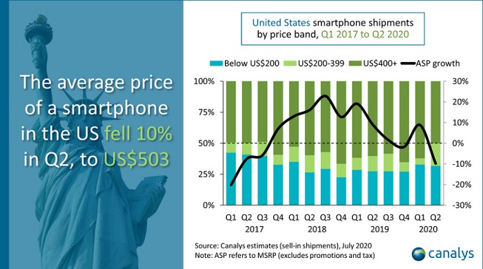 Canalys 预计,苹果和三星仍是美国智能机市场的两大巨头,每 10 部设备中有 7 部来自这两家公司。其中 iPhone 在 2020 年 2 季度创下了 1500 万部的新纪录,较 2019 年最畅销的 iPhone XR 机型还高出了 15% 。
