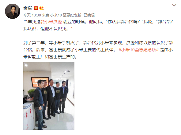 此外,雷军还在微博中提到小米10至尊纪念版是由小米智能工厂和富士康生产的。