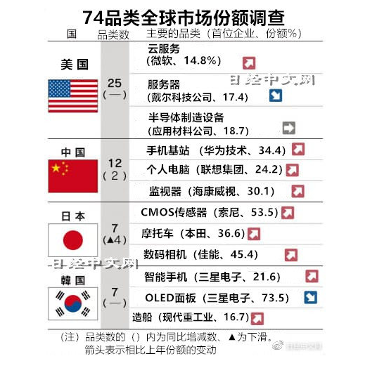 8月13日消息,日经发布的2019年“主要商品与服务份额调查”显示,中国在手机基站、电子零部件等12个品类上获得最大份额,比上年多2个品类,反超日本,在各国和地区中排在第2位。据了解,这份调查共计包含74个品类。中国在12个品类中取得了领先。
