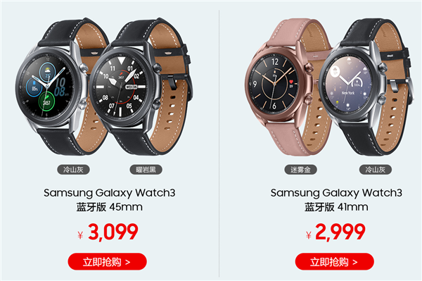 在今晚的发布会上,三星也推出了新一代智能手表Galaxy Watch 3系列,支持LTE、BT蓝牙两种网络,有41mm、45mm两种规格,国内售价2999、3099元起。Galaxy Watch3屏幕为Super AMOLED,分辨率360×360,支持全彩AOD,覆盖康宁大猩猩玻璃DX,支持5ATM+IP68防水防尘、MIL-STD-810G军规标准,商店内还提供超过8万种表盘图案、40多种表盘界面。