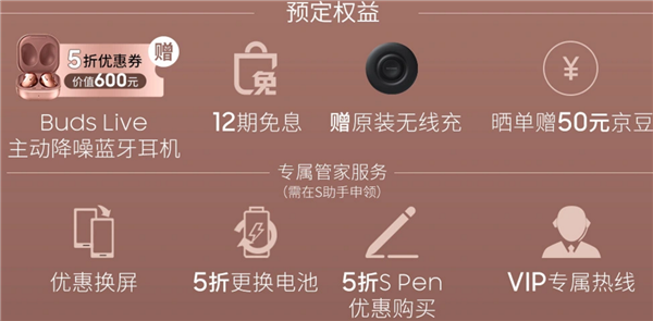 目前首发预定还有不少优惠,可以12期免息分期,赠送原装无线充,还可以优惠换屏,5折换电池,5折买S Pen,还有价值600元的Galaxy Bud Live无线耳机优惠券。