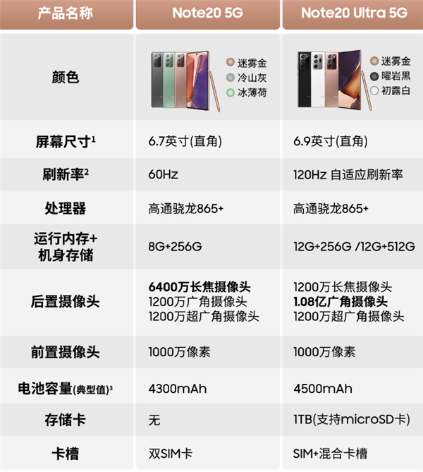 Note 20 Ultra则是迷雾金、曜岩黑、初露白三种风格,机身厚度8.1毫米,重量208克,6.9英寸曲面屏,分辨率3200×1440,刷新率120Hz,HDR10+认证。