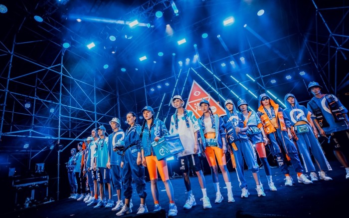 据了解,蓝骑士潮服灵感来自于蓝骑士的工装风格,结合城市机能、国潮元素,颠覆传统外卖小哥形象。