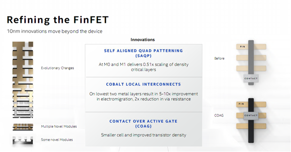 在这一代的10nm工艺节点上,Intel同样融入了诸多新技术,比如自对齐四重曝光(SAQP)、钴局部互连、有源栅极上接触(COAG)等等,但它们带来的挑战也让新工艺的规模量产和高良品率很难在短时间内达到理想水平。