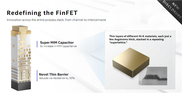 该技术的实现得益于一类新型的高K电介质材料,它可以堆叠在厚度仅为几埃米(也就是零点几纳米)的超薄层中,从而形成重复的“超晶格”结构。这也是Intel独有的技术。