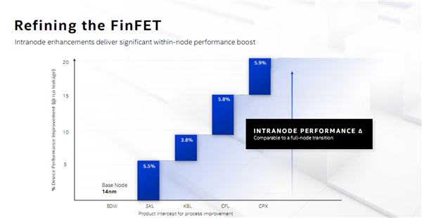 即便是饱受争议的14nm工艺,Intel也在一直不断改进,通过各种技术的加入,如今的加强版14nm在性能上相比第一代已经提升了超过20%,堪比完全的节点转换。