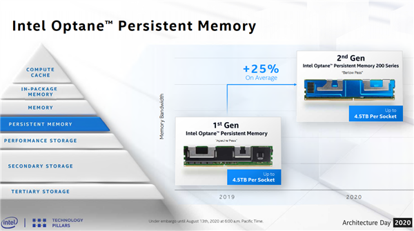 3D XPoint除了用于生产傲腾SSD硬盘之外,还可以用于傲腾可持久性内存,今年Intel已经推出了傲腾200系列可持久性内存,外观类似内存,单条容量最多可达512GB,可与内存混搭,每路六通道12条插槽,可以安装最多6条傲腾内存,总容量最多3TB,再加上6条256GB DDR4内存,单路系统内存总容量就可以达到惊人的4.5TB。