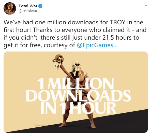 开发商Creative Assembly官方通过推特宣布,《全面战争传奇:特洛伊》在Epic上线1小时的时间里,玩家下载总量突破100万份!官方表示了对玩家的感谢,并提醒玩家如果还没有领取到游戏,在剩余的21.5个小时里还可以免费领取!