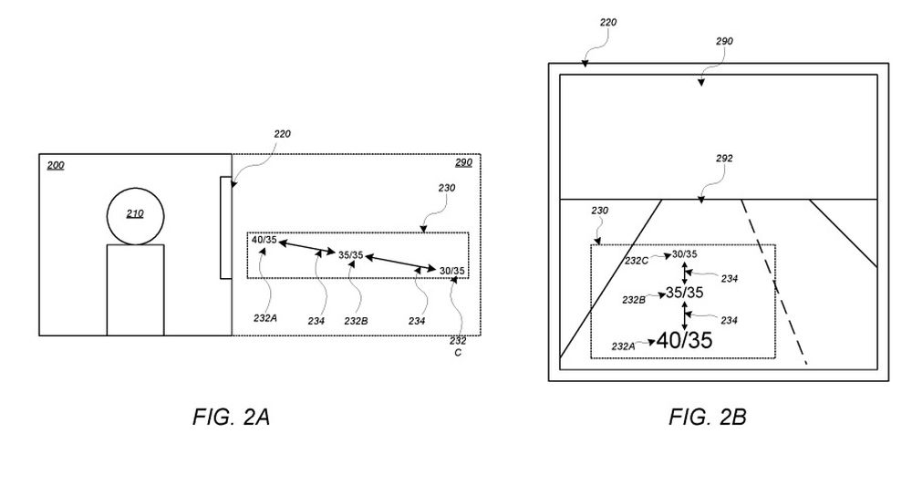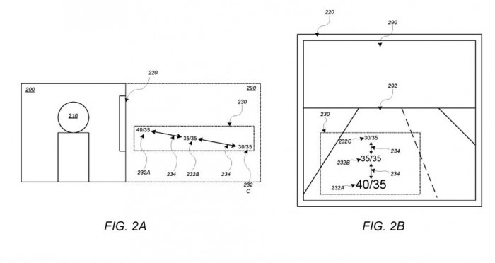 另一项专利利用了增强现实(AR)增强车载系统。在“Augmented reality display system”(增强现实屏幕系统)专利中,创建了一个或者多个透明的表面,例如挡风玻璃。通过 AR 系统能够向乘客、驾驶员显示车辆的重要信息,例如车速、导航等等。