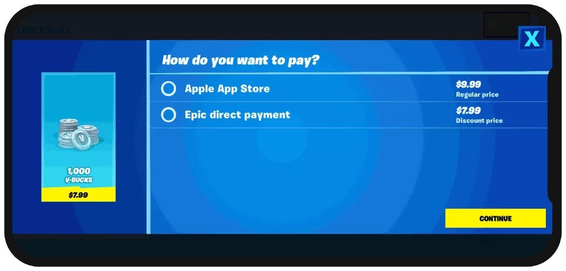 原本1000游戏币在App Store中购买需要9.99美元,使用EPIC自己新加入的付费渠道,价格变成了7.99美元。