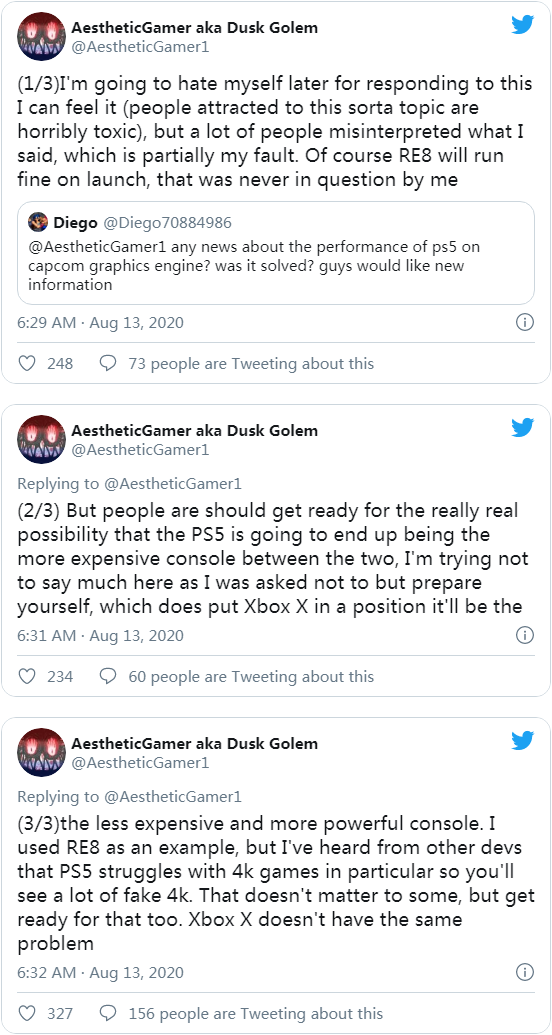 其实早些时候,知名卡普通内幕爆料人 Dusk Golem 也提到过 PS5 很难在早期实现“真 4K”体验。作为应对,开发者需要借助棋盘渲染和即时插帧等“假 4K”解决方案。